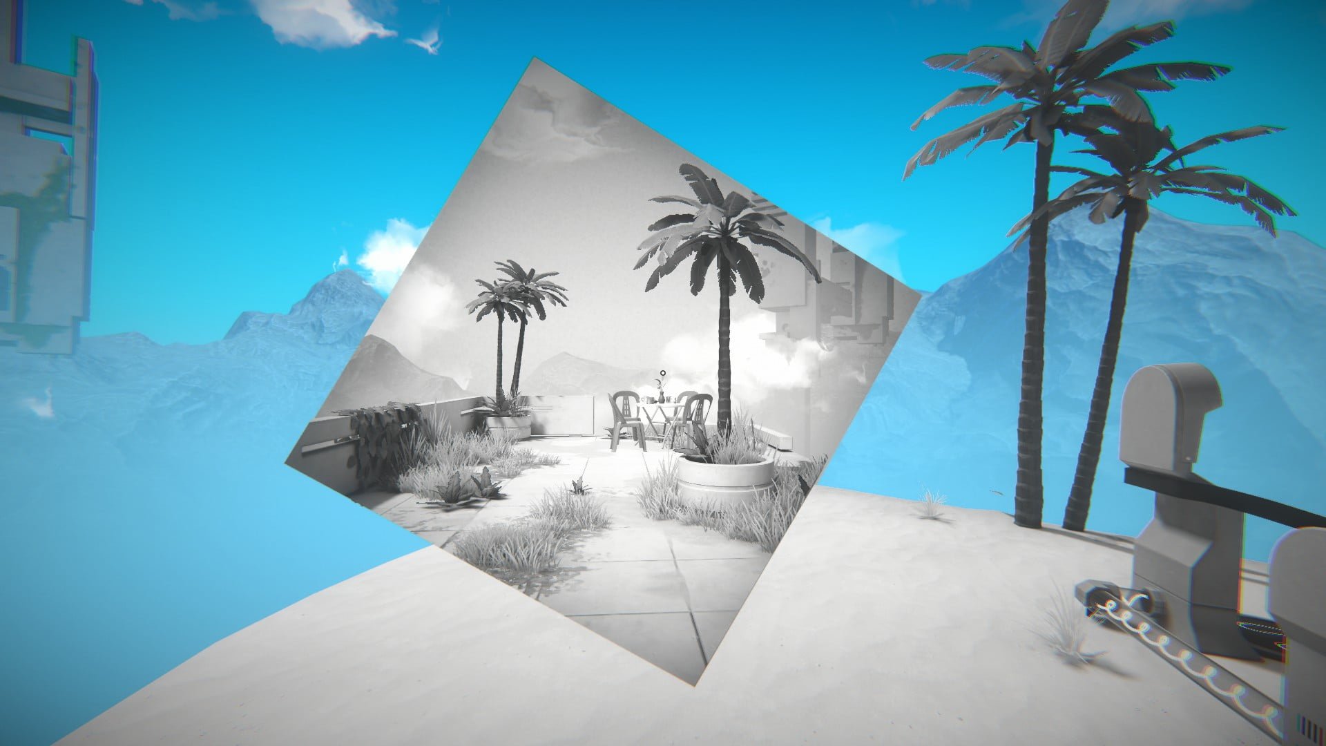 Viewfinder’s impressive gimmick and most satisfying trick never gets old. While navigating around some relaxing, almost Grecian environments, you find an old black and white photograph of an arch. Picking it up, you can then “place” the arch into the environment; the entire contents of the photo becomes real and interactable, overwriting anything behind it, allowing you to walk through the arch and explore the interior of the photo.