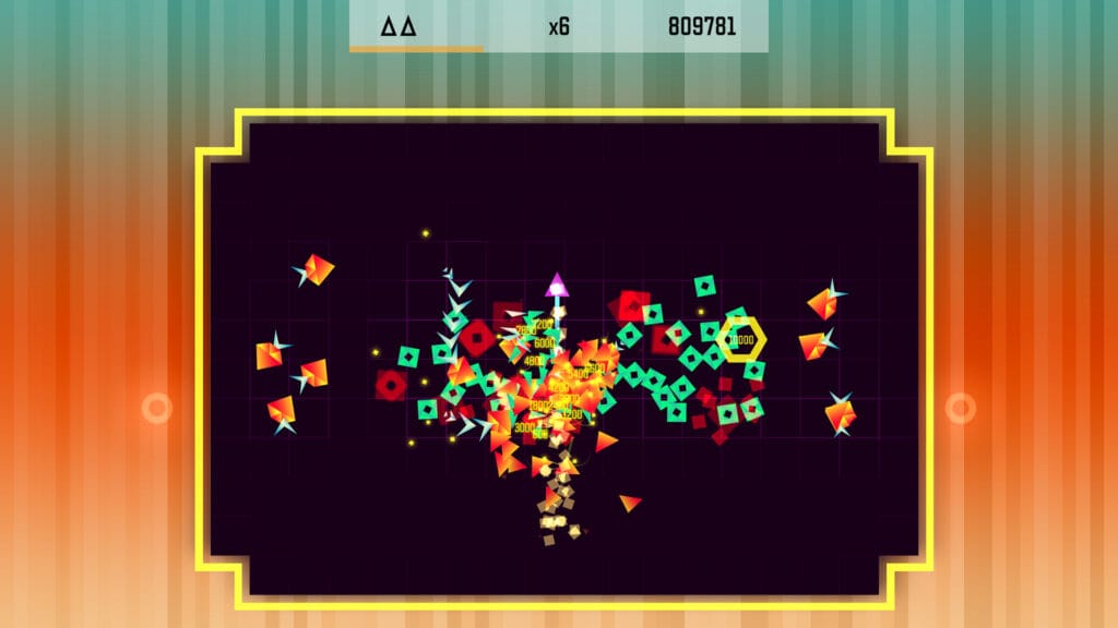 Cutting through the mass of rotating shapes and seeing through your own waves of bullets and missiles, an ever expanding hose of death, is exhilarating. At the highest most intense moments, it’s like balancing on a knife’s edge as the enemy hordes continue to grow to match your increasing firepower, the fear of one little slip ending you’re run short growing with every second as you graze foes and projectiles alike, weighing the risk/reward of going for upgrade and score tokens and glimmer to spawn more of those tokens versus waiting and making sure you’re not going to get caught in the midst of an arena shift, let alone collide with a stray bullet or enemy because your focus drifted for a moment.