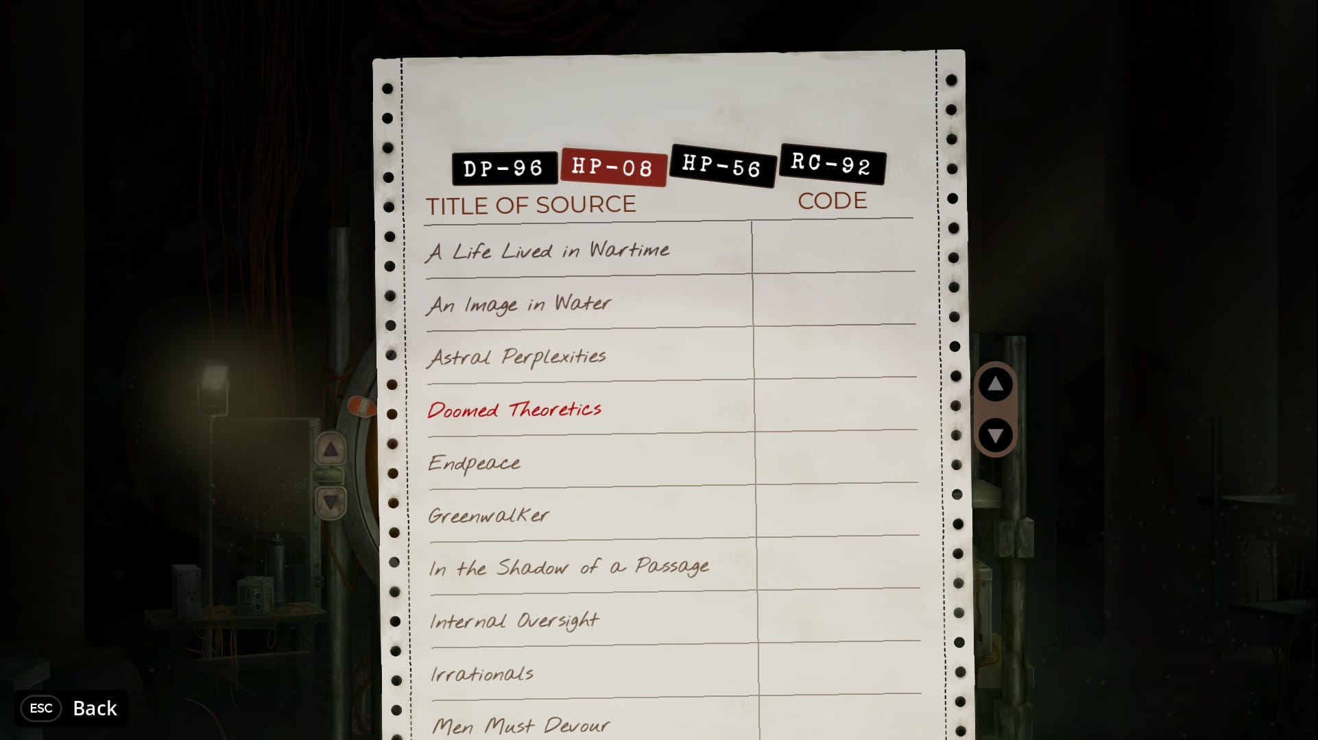 TR-49 is a game which feels like a merger of Her Story, Return of the Obra Dinn and The Roottrees Are Dead, combining the deductive aspects of the former with the clunky, old-fashioned computer interface of the latter. Each record in the machine has a catalogue reference made up of two letters and two numbers. You can input any record number you want, but you have no idea which ones will return results. The machine is also very glitchy and will often display garbled text and gibberish, but the text will become more legible when you correctly assign the catalogue number to the correct title. A record may say a novel was published the year an author died, or may say they’re associated with another writer. You can use this information to gradually piece together a broader picture.