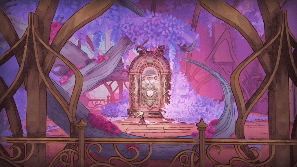 Constantly chaining actions together in one smooth motion, sometimes with little time to react to what’s next, is tricky but extremely gratifying. The longest and most challenging sequences have you moving through winding tunnels lined with deep red foliage, tendrils slowly reaching toward you as you pass by, without ever being able to set foot on solid ground, every corner adding some new complication to the road ahead. MIO‘s platforming is at its strongest and most demanding in these moments. Every single one of her abilities are put to use, the game constantly making you walk a knife’s edge with each new maneuver.