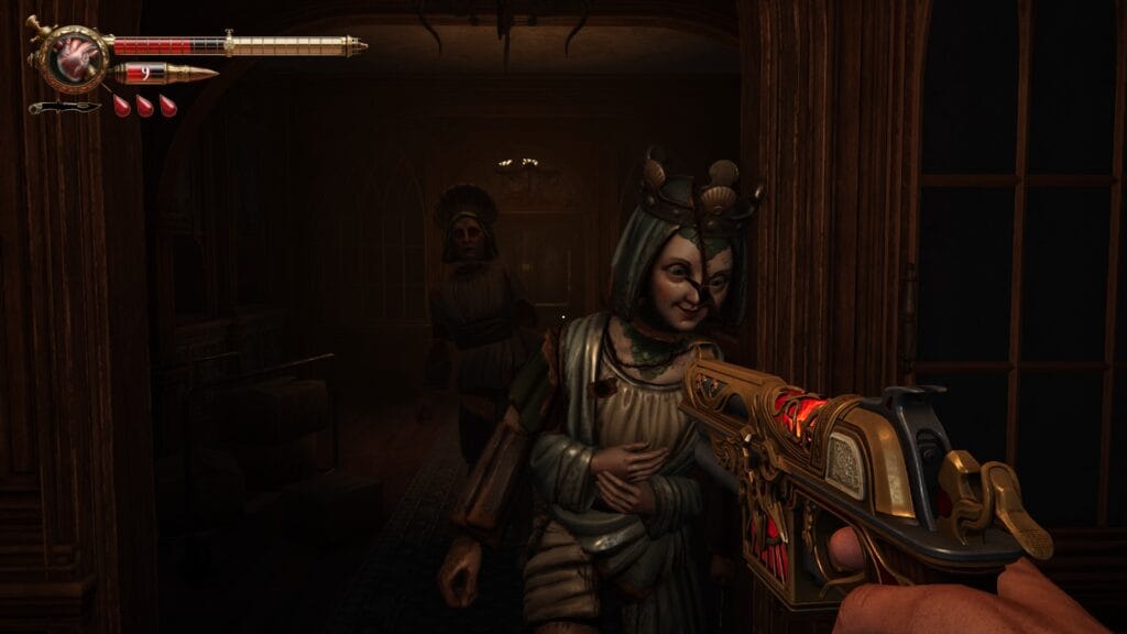 Combat has a deliberate pace. The cursed statues stagger quite slowly towards Gabriel, almost always attacking from the front. Most of the guns have slow rates of fire, at least until upgraded with those silver coins at the mysterious vendor, “La Planidera”. These weapons have a crucial twist which sits at the heart of Crisol gameplay – magically modified by The Sun, they use Gabriel’s own blood (and therefore health) as ammunition. In theory, this necessitates careful resource management. In practice, Vermila seem worried about the implications of this unified ammunition pool – plasmarine shots, which restore Gabriel’s blood, are common – particularly in Chapter 3.